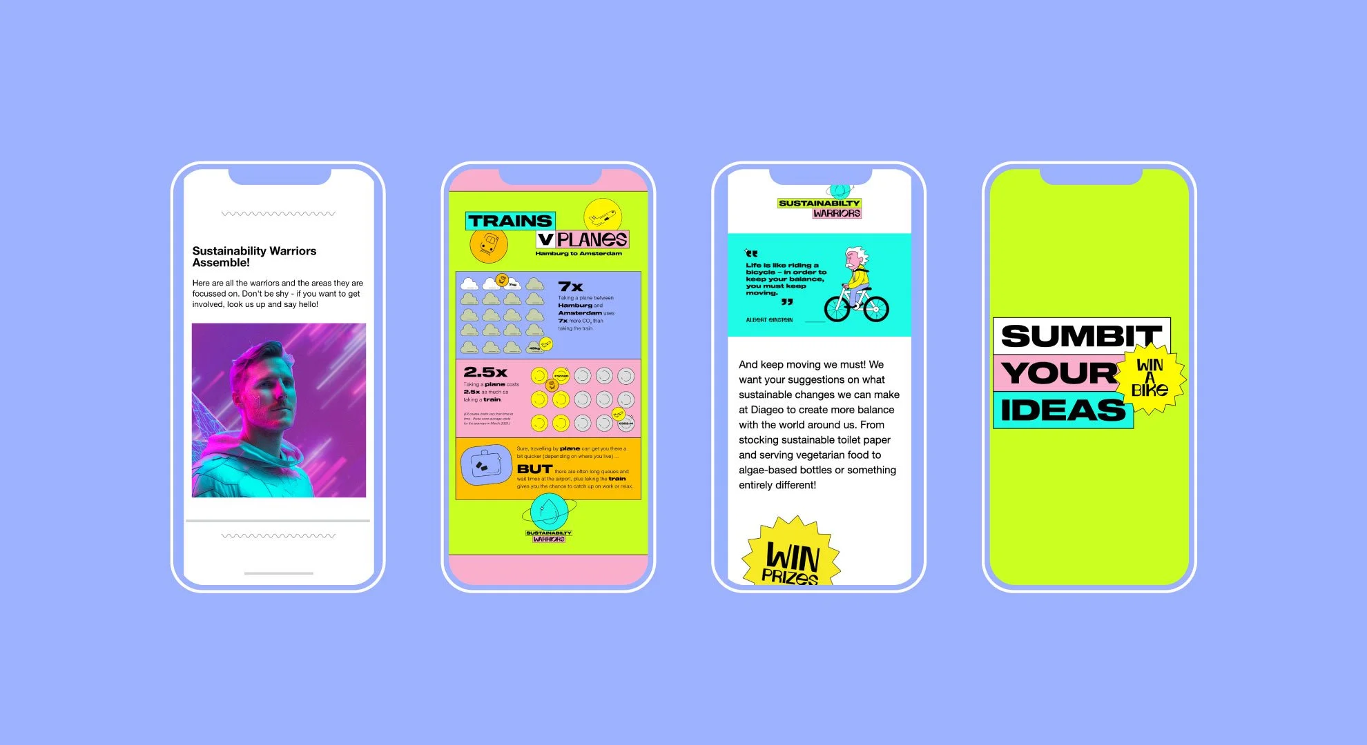 The ‘Sustainability Warriors’ are Diageo’s internal sustainability team for Northern Europe. Our brief was to create a visual identity & tone of voice to grab people’s attention and ensure the information they share is engaging, digestible and stands out from their more traditional ‘corporate comms’.